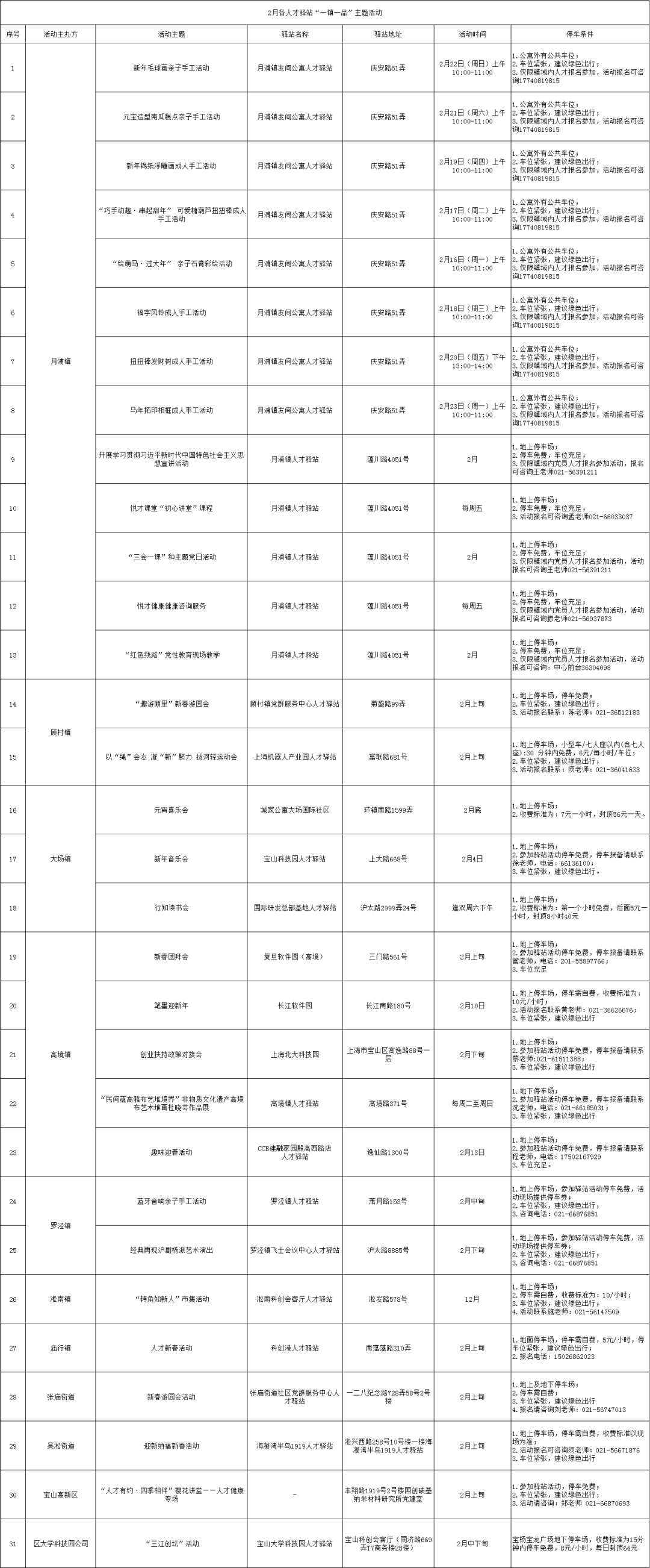 瑞气盈庭,嘉年启序 人才新春活动 元宵喜乐会 “三江创坛”活动 “樱才沙龙”——青年人才新年专场 …… 宝山人才月历·2月刊 祥瑞迎新兆,邀您共谱人才奋进华章。 一月精彩回顾 #1 1月11日,由宝山区人才局精心策划的“才聚宝山·笑迎新春”高层次人才新春专场脱口秀活动在宝山区共和新路的开心麻辣烫演艺中心欢乐上演,活动聚焦沪上生活百态,以幽默与温度,吸引区内高层次人才携家人齐聚,为辛勤耕耘的各领域人才带来别样精神享受,送上真挚新春祝福。 具体内容详见下方推文: 高层次人才新春专场脱口秀活动欢乐上演! #2 1月19日下午,宝山区人才局、中国人寿保险公司携手吴淞街道举办了“人才有约,四季相伴——樱花讲堂”系列活动之个人养老金政策解读讲座。此次活动聚焦人才养老规划实际需求,得到了辖区20余名来自各行业的专业技术人才、企业HR和职场骨干的热烈响应和积极参与。 具体内容详见下方推文: 人才有约 保障相伴——吴淞街道举办个人养老金政策解读专场 #3 1月28日傍晚,宝山区人才工作局在南大金地草莓社区举办“人才有约,四季相伴——樱花讲堂”系列活动之人才年夜饭专场活动。活动现场各行业留沪人才积极参与,大家一起捏制饺子、共享佳肴,围炉畅谈在宝山的逐梦故事与生活感悟,真切感受“他乡亦故乡”的归属感,凝聚起深厚的英才情谊。 具体内容详见下方推文: 【樱花讲堂】人才年夜饭活动在南大金地草莓社区顺利举办 二月精彩预告 2026年2月 日 一 二 三 四 五 六 1 2 3 4 5 6 7 8 9 10 11 12 13 14 15 16 17 18 19 20 21 22 23 24 25 26 27 28 2月4日 大场丨新年音乐会 2月上旬 顾村丨“趣游顾里”新春游园会 2月上旬 庙行丨人才新春活动 2月上旬 樱花讲堂丨人才健康专场 2月上旬 吴淞街道丨迎新纳福新春活动 2月上旬 樱才沙龙丨青年人才新年专场 2月10日 高境丨笔墨迎新年 2月18日 月浦丨福字风铃成人手工活动 2月底 大场丨元宵喜乐会 #1 “人才有约,四季相伴——樱花讲堂”系列活动 ——人才健康专场 活动对象: 区重点服务企业、区属国有企业,以及经街镇(园区)推荐企业中的部门负责人、HR等。 活动时间: 2月上旬 活动地点: 宝山城市工业园区丰翔路1919号2号楼国创碳基纳米材料研究所党建室 停车条件: 车位紧张,建议绿色出行;活动咨询及报名请联系李老师:021-56103450。 活动内容: 围绕区内重点企业人才关心的人才健康等方面开展樱花讲堂专题培训活动。 #2 “人才有约,四季相伴——樱才沙龙”系列活动 ——青年人才新年专场 活动对象: 区重点服务企业、区属国有企业,以及经街镇(园区)推荐企业中的青年人才等。 活动时间: 2月上旬 活动地点: 宝山区南蕰藻路310弄 停车条件: 车位紧张,建议绿色出行;活动咨询及报名请联系李老师:021-56103450。 活动内容: 面向全区青年人才,开展青年人才喜闻乐见的新年活动,现场推介宝山区青年人才伴飞计划,为现场活动青年人才提供免费打车券等活动奖品。 此外 2月宝山区各人才驿站 “一镇一品”主题活动也已新鲜出炉 诚邀广大人才积极参与 另外,各街镇(园区)和相关主管单位 2月人才服务日活动也已准备就绪 欢迎来访 享受就近办件、政策咨询、落户规划和关键小事等 一揽子服务 说明: 1.以上活动主要面向经认定的宝山区人才服务重点企业,或注册在宝山区的科技型、成长型以及留学人员(海外人才)企业,具体活动安排及参会情况请以实际情况为准。 2.部分活动具体时间尚未确定,欢迎各位人才通过报名链接了解最新信息! 3.宝山区各人才驿站“人才服务日”活动,均由区人才发展服务中心选派区级人才服务专员独立或组团式开展,符合条件的宝山区企业,可派员就近参与,或参加毗邻区域“人才服务日”活动。 4.咨询电话:宝山区人才发展服务中心:021-56103450。 365天公开征集! 优质人才课程资源持续征集ing~ 为深化宝山人才服务阵地建设,持续丰富课程品类与内容,不断满足宝山区各类人才对知识、专业、技能等素养提升的需求,现面向全社会征集课程资源,构建专业性、实战性、创新性《宝山人才·课程谱系》。 征集范围:课程征集涵盖多个领域,包括但不限于劳动保障类、政策法规类、经营管理类、创新发展类、金融财税类、文化艺术类、运动健康类、文化赏析类等。课程免费且不用于任何营利目的。 课程受众及授课地点:主要用于樱花讲堂等区级人才品牌活动,面向人群为在宝山工作的企业负责人、HR等行政人员、新入区青年人才、中青年骨干人才,以及其他在宝山企业和社会组织创新创业的人才;授课地点主要在宝山区域范围内。 如您有意申报,请扫码填写课程申报表(见附件)并加盖单位公章后,发送至邮箱:bsyhjt@126.com。