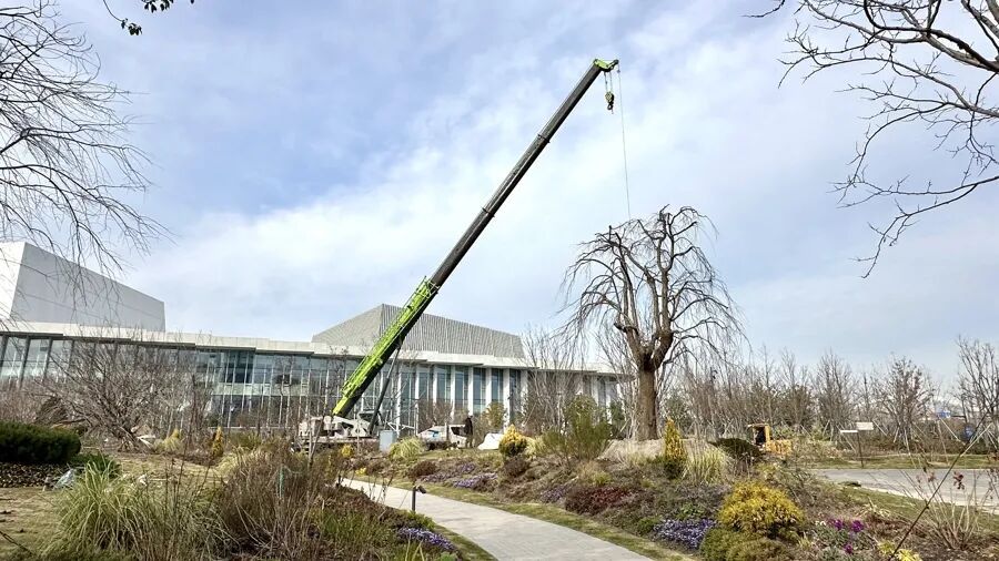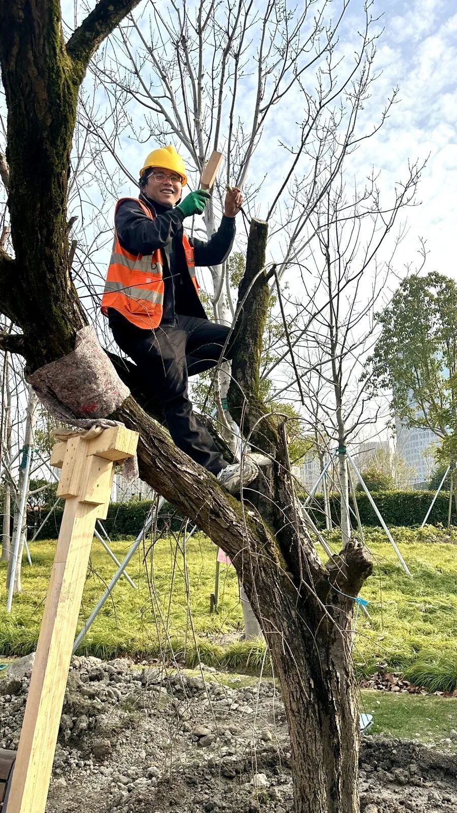 在现场,来自浙江人文园林的盆景大师攀爬在树上,用盆景手法处理树木枯枝:“我们希望打造‘枯荣并济’的感觉,将断枝借势做出舍利感。原先应用在盆景上的手法,现在被用到了苗木上。”垂枝梅与普通梅花差异很大,一是特别高,二是形态完全不同,而这种奇异的形态主要靠高水平的园艺修剪才能长成。