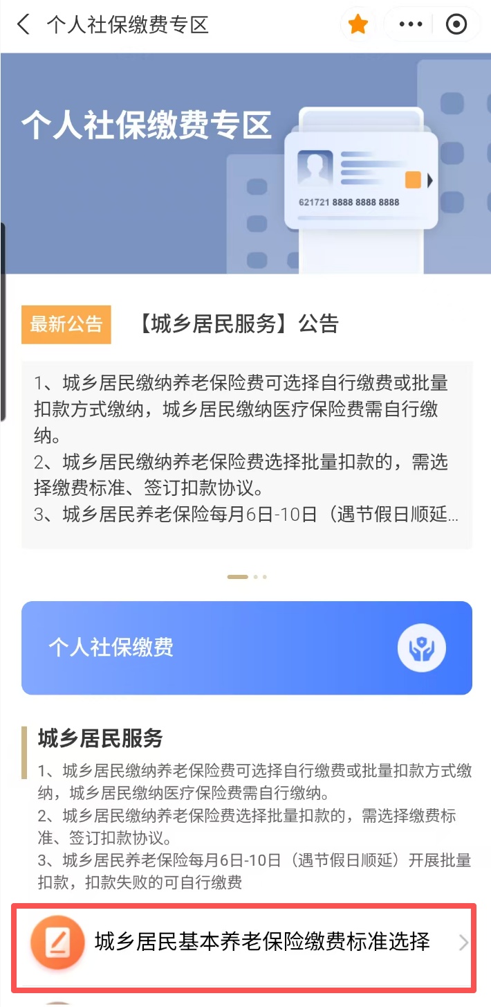 打开“随申办市民云”(APP/微信小程序/支付宝小程序),在首页搜索“个人社保缴费专区”,或下滑至【精选主题】找到【社保缴费】。在“个人社保缴费专区”页面选择“城乡居民基本养老保险缴费标准选择”。