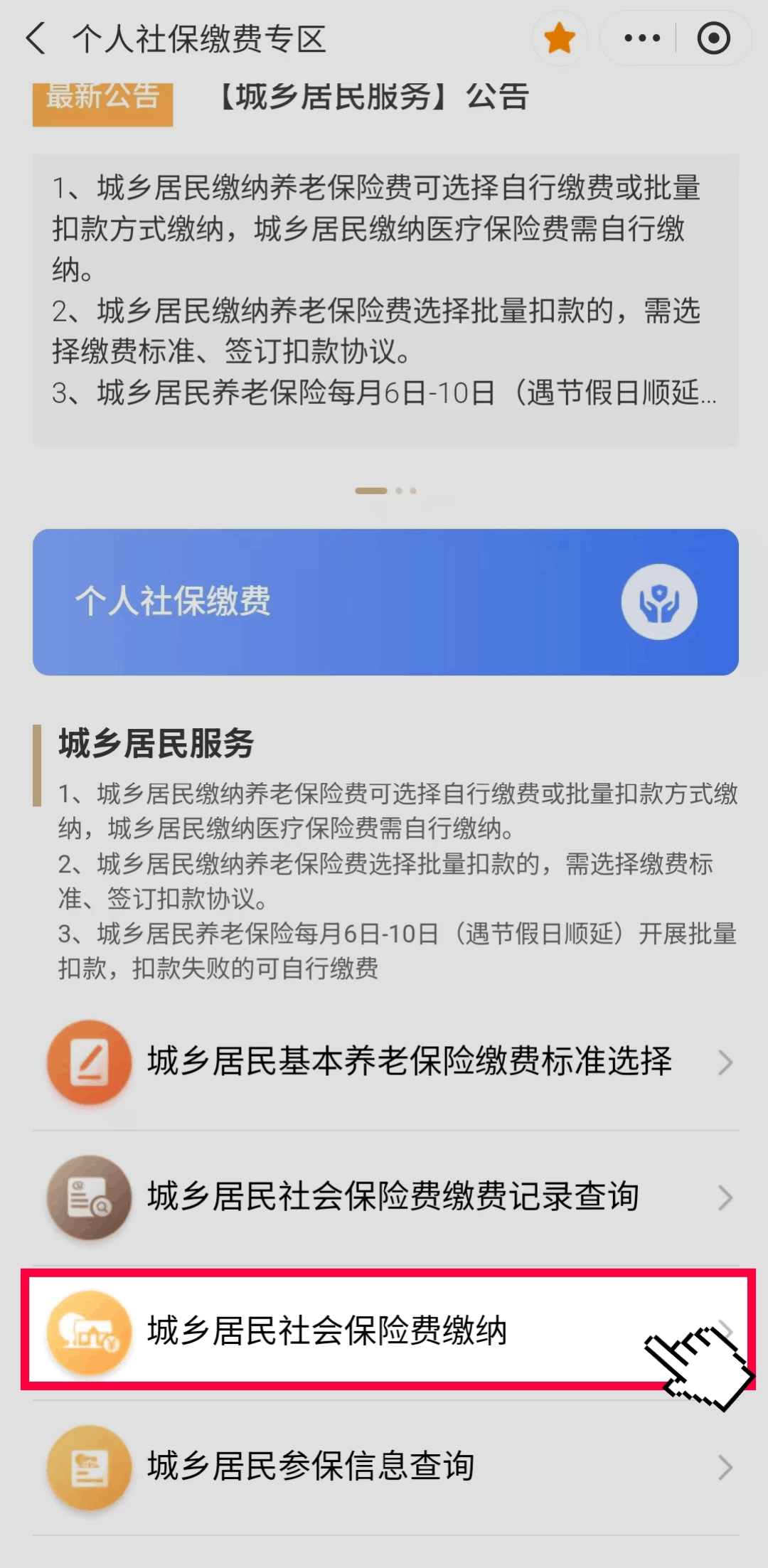 通过“随申办市民云”(APP/微信小程序/支付宝小程序)“个人社保缴费专区”,下滑找到“城乡居民社会保险费缴纳”。