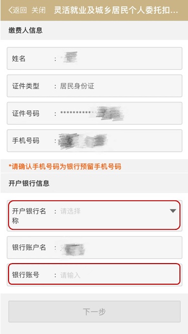缴费人信息由系统自动带出,填写“银行预留手机号码”,选择“开户银行名称”,输入“银行账号”后,点击“下一步”。
