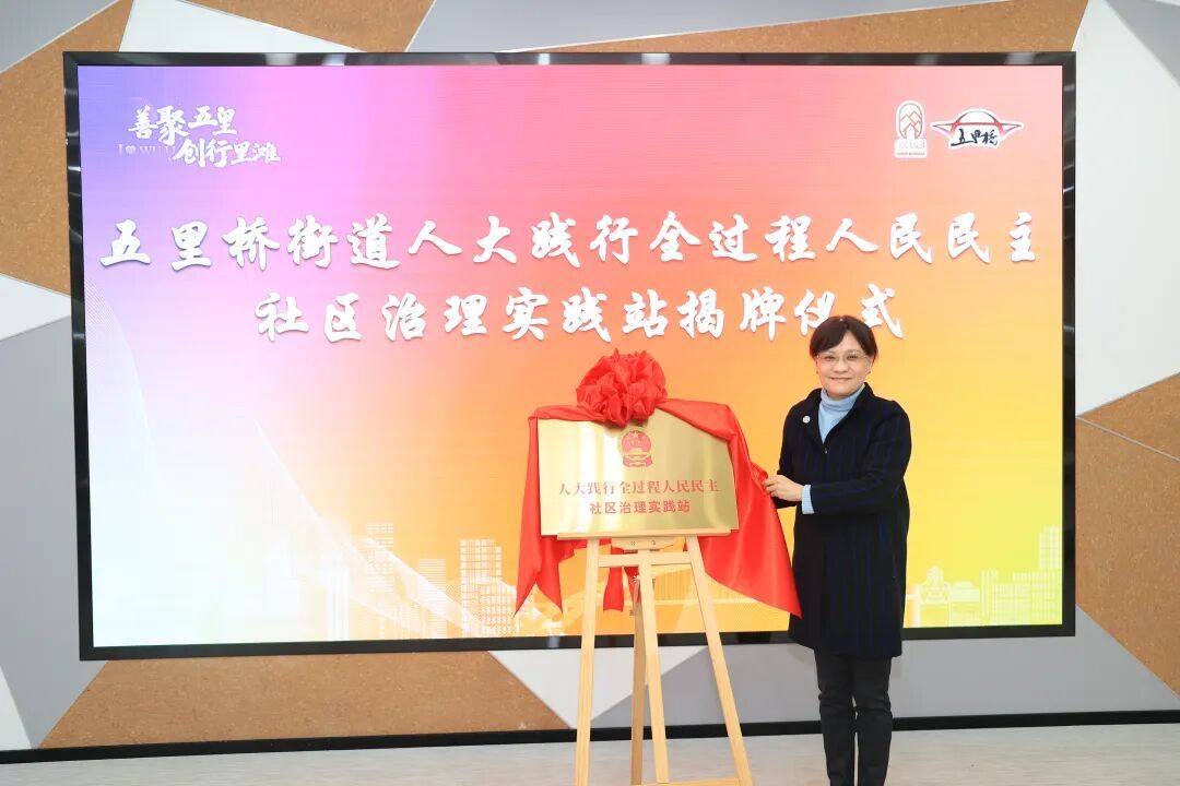 黄浦区人大常委会副主任、区总工会主席姚晓红为人大践行全过程人民民主社区治理实践站揭牌。
