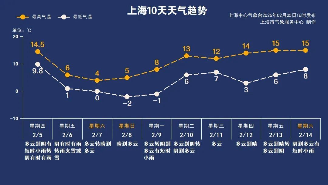 双休日上海天气转晴,北风阵阵气温低迷,体感干冷;下周上海是“两头阴雨中间晴”的天气,气温整体有所回升,周中后期最高气温在12~15℃之间。