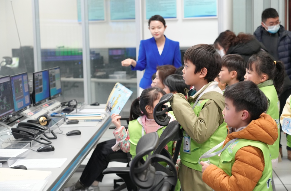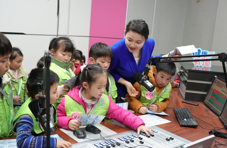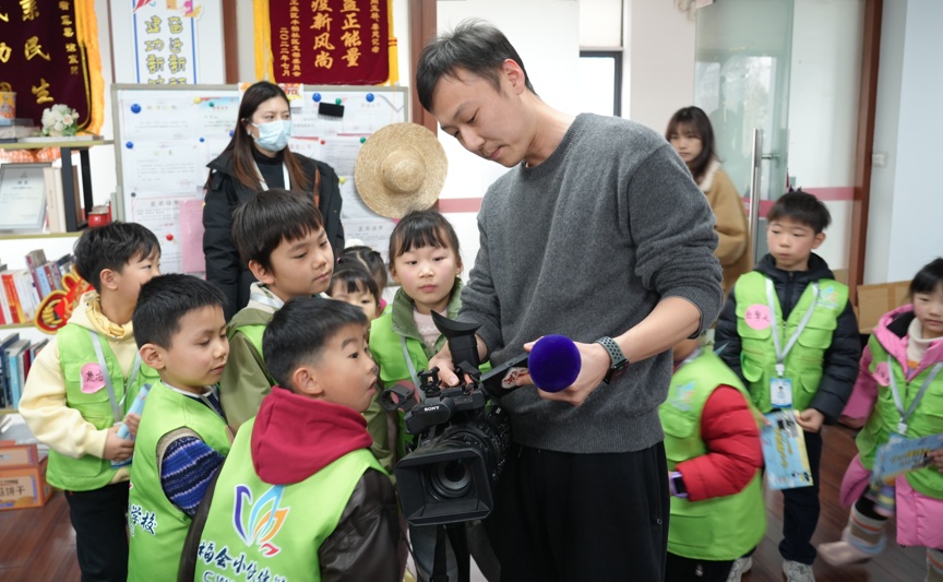 “大家猜猜看,我们的电视塔有多高?”“148米!”在嘉定区融媒体中心演播厅内,主持人齐佩榕以轻松互动的方式向小学员们介绍融媒体中心的整体布局和功能分区,现场气氛活跃。