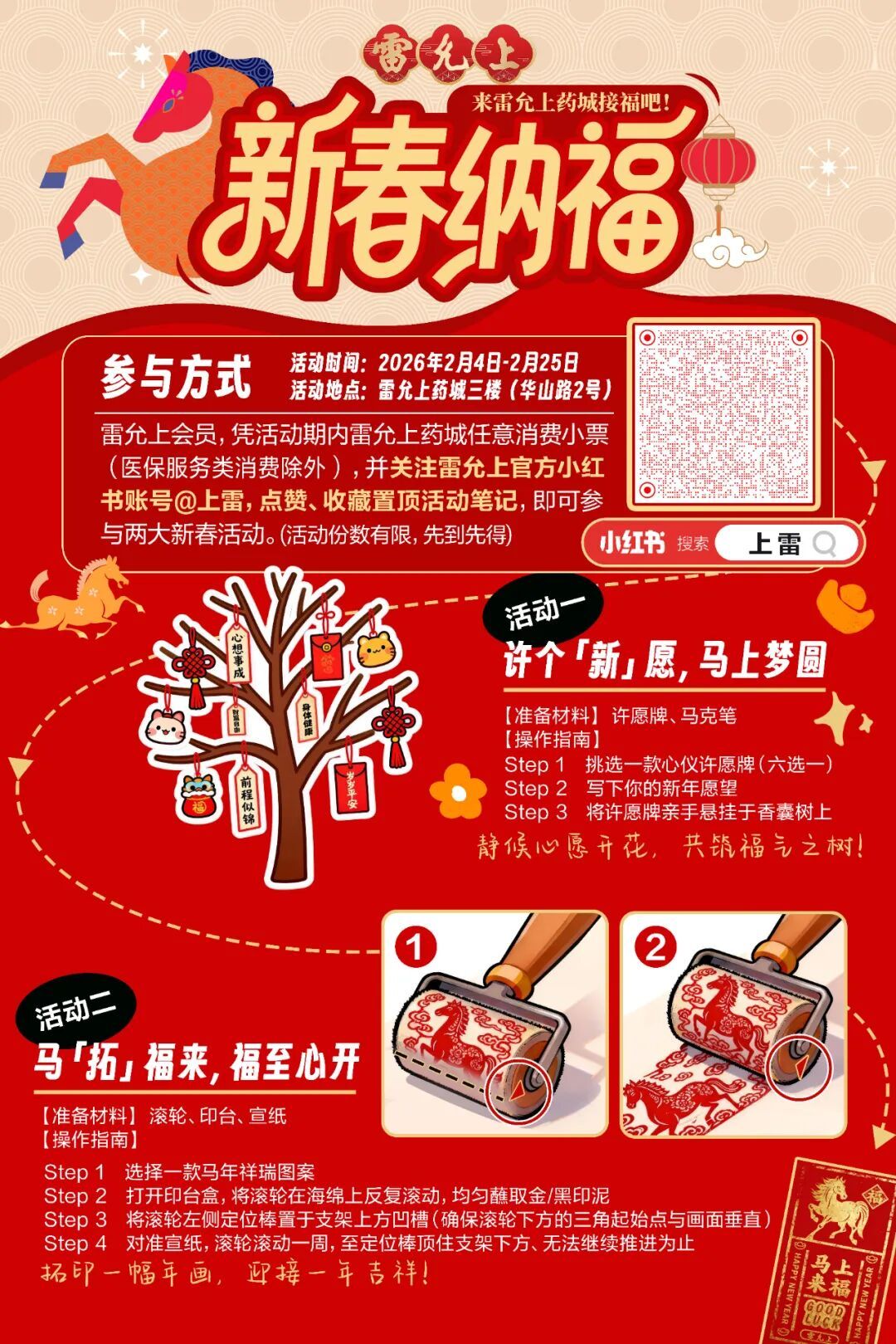 据雷允上西区介绍,为呼应“一年之计在于春”的美好寓意,雷允上药城自2月4日起,将陆续开展一系列富有仪式感的新春互动活动。比如,“马‘拓’福来”拓印体验活动欢迎消费者亲手制作一款骏马祥纹纪念图案,留下“一马当先”的美好期盼;“香囊树”许愿区结合小红书打卡,让心愿借芬芳传递。