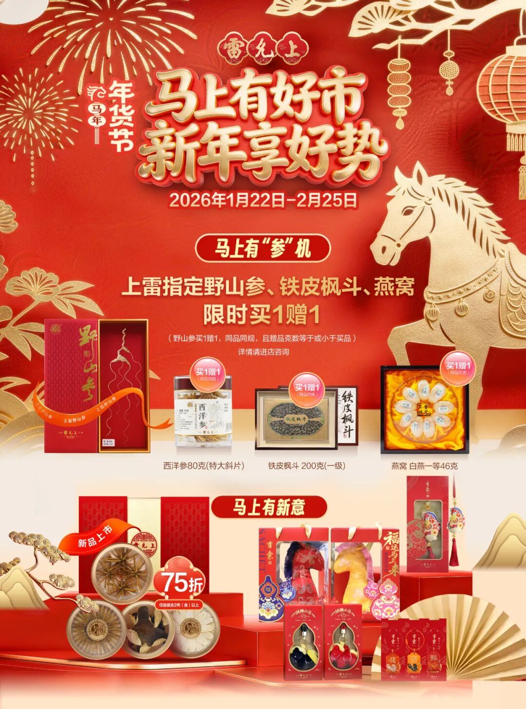滋补年货节上,不仅有上雷指定野山参、铁皮枫斗、燕窝等“买1赠1”年度回馈活动以及多款滋补臻品优惠促销,还有全新亮相的野山参“红气养人”新包装,让送礼更显年味与心意。全新上市的“臻萃系列”采用雅致圆罐包装,消费者可以自行组合购买,即可自用养生,亦可作为健康年礼,为新年注入充沛活力。