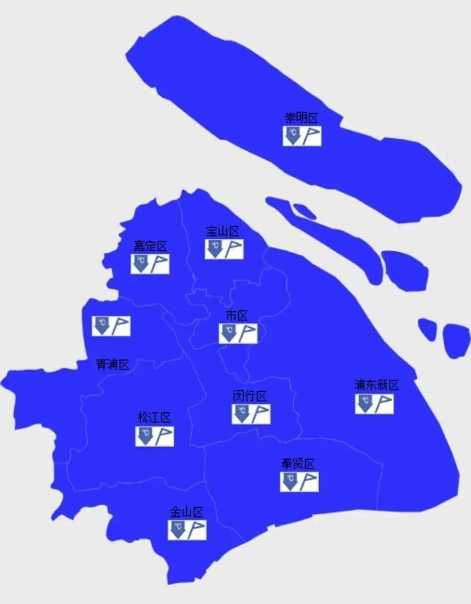 随后,浦东、闵行、奉贤等9区密集发布寒潮蓝色预警信号、大风蓝色预警信号,短短11分钟,发了18个预警。