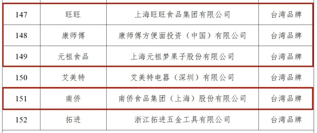 2月3日,工业和信息化部正式公布2025年度中国消费名品名单,涵盖轻工、纺织、食品、医药四大领域,包括企业品牌165个、区域品牌76个、特定人群适用产品品牌35个。2025年度首次将港澳台企业纳入中国消费名品,助力两岸产业融合发展。旺旺、康师傅、元祖、南侨等台湾品牌入选2025年度中国消费名品名单。