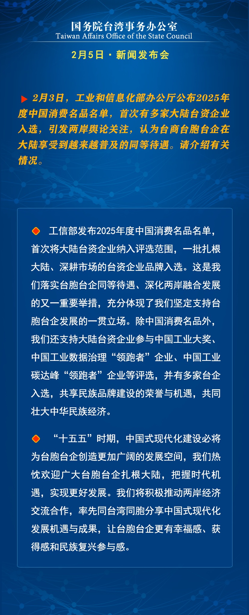 国台办:台资品牌入选中国消费名品名单是落实台胞台企同等待遇的重要举措