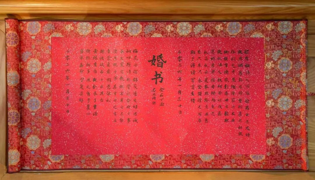 本活动婚书由百年老字号“朵云轩”承制,以红地回纹团花织锦为裱,国家级非遗大红洒鱼籽银粉蜡笺为纸,藏佳偶盟誓,传岁月珍情,您可至集市朵云轩摊位咨询。