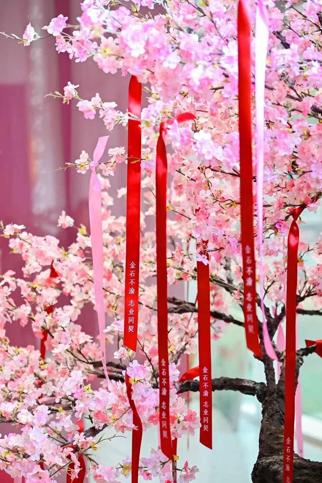 阅剧场外廊咨询台领取“金石不渝 志业同契”专属丝带,写下心愿系于桃花树上,并拍照。