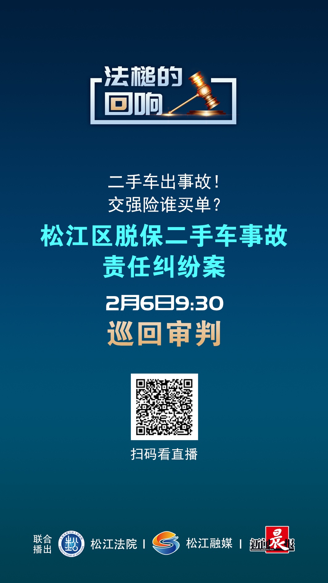 2月6日9时30分,上海市松江区人民法院审理的一起“脱保二手车交通事故责任纠纷案”来到松江区交通警察支队开展巡回审判,本场庭审将通过“上海松江”客户端网络直播。