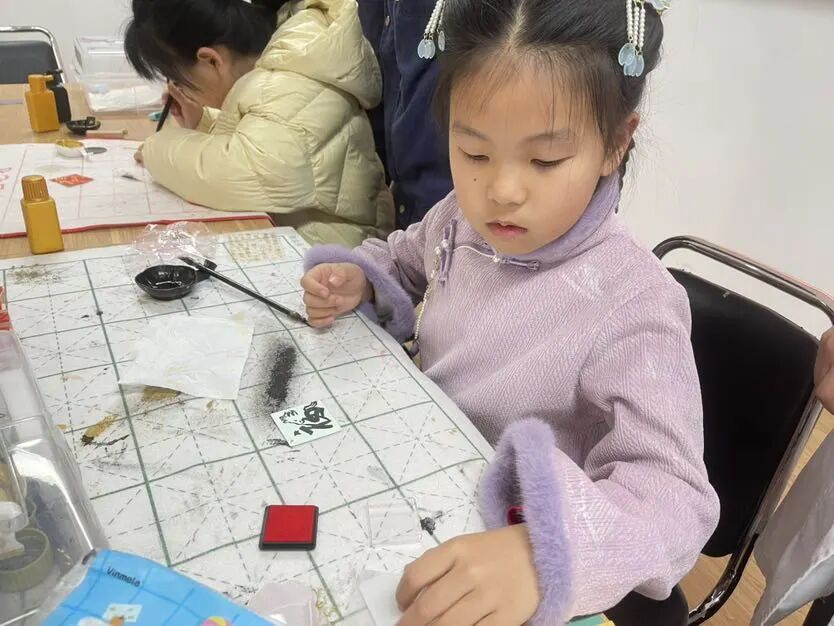 活动伊始,孩子们率先拿起毛笔,在卡纸上凝神挥毫,将灵动的骏马纹样与福字巧妙融合,有的将马首勾勒于福字转角,有的以马尾线条衬着福字笔画,骏马蹄步生风,福字端庄喜庆,既暗含马到成功的美好祈愿,又尽显传统笔墨的韵味。