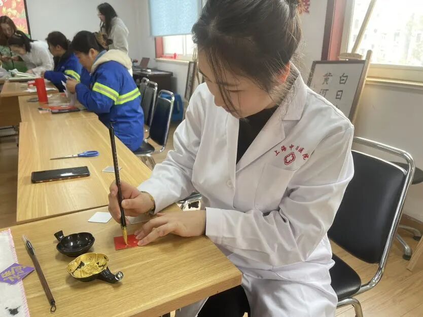 随后,教学环节正式展开,环卫工人、医护人员围坐一起,在孩子们的耐心指导下开启创作。小老师们从握笔写福、图案绘制,到福字覆膜、装饰粘贴,一步步细致讲解、手把手示范,大家认真跟随步骤,在孩子的帮助下完成专属福字冰箱贴。