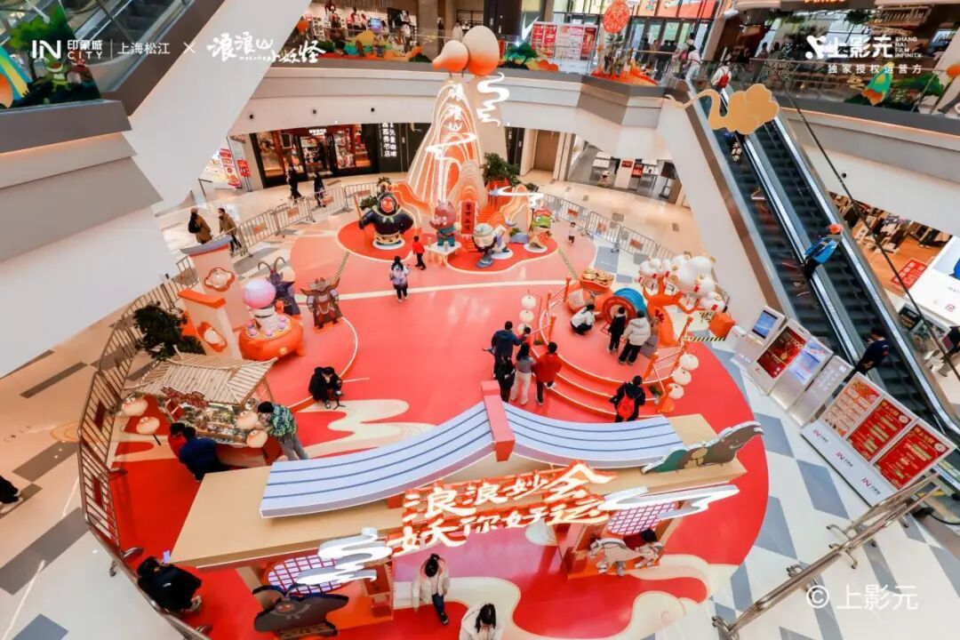 一走进松江印象城一楼中庭,6米高的“浪浪山”主题装置就让人眼前一亮。层峦叠嶂用传统水墨晕染手法描绘,山间“住”着动画里那些熟悉的小妖怪,个个活灵活现。装置四周悬挂喜庆灯笼,年味浓郁。
