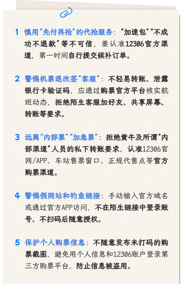 春运车票再紧张,也不要轻信所谓“黄牛”“内部渠道”“铁路工作人员朋友”。官方购票渠道为:12306官网/APP、车站售票窗口、自助售票机、铁路授权的正规代售点。任何让你先转账、私下打款的,都要高度警惕。
