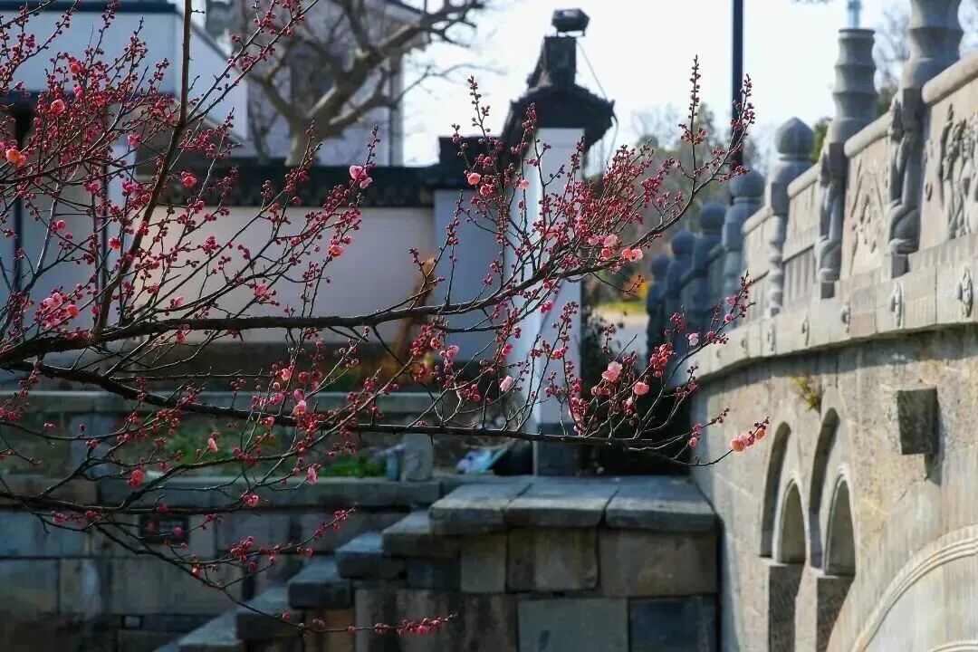 白墙青瓦作衬,梅枝斜伸于水岸古桥旁,古遗址的厚重底蕴与梅花的清雅灵动相互映衬,步步皆景。