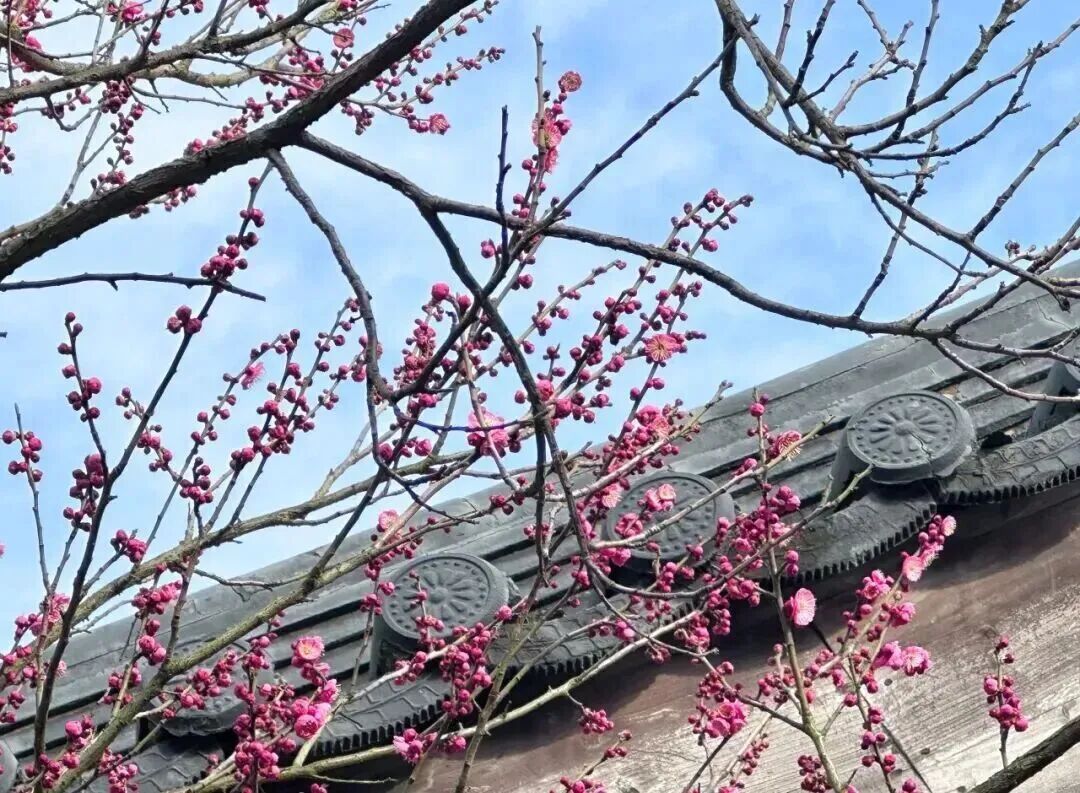 白墙黛瓦作底,回廊流水相映,梅枝斜倚、花影落水,梅的清雅与江南园林的婉约完美相融。