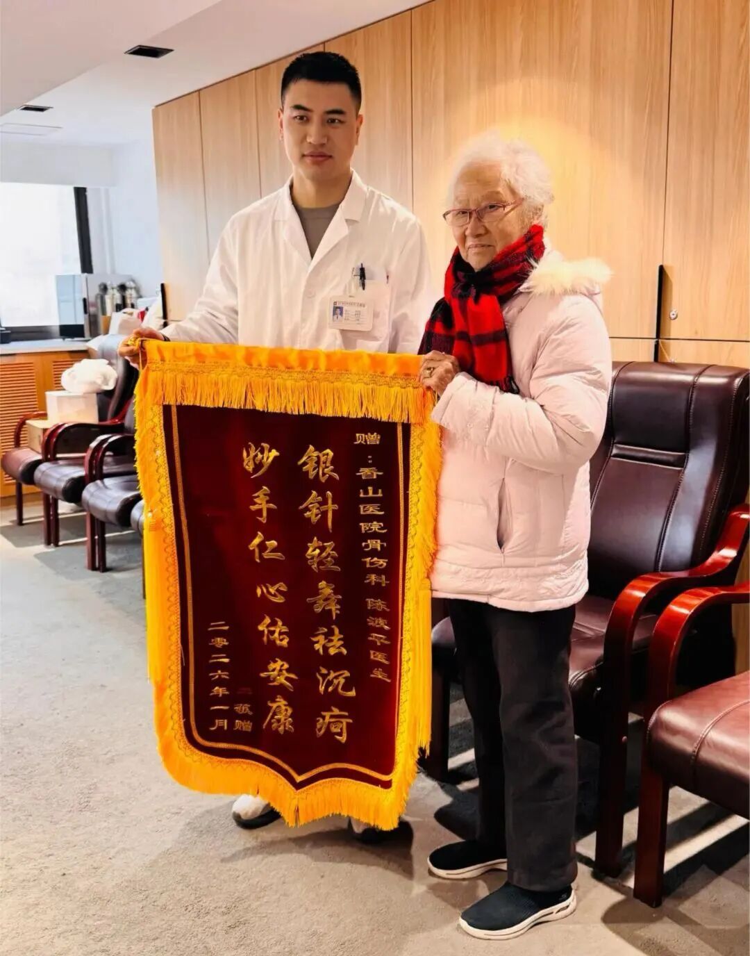 近日,黄浦区香山中医医院复兴路院区住院部洋溢着温暖的气息,80余岁的蒋阿姨怀着感恩之情,专程送来一面印着“银针轻舞祛沉疴,妙手仁心佑安康”的锦旗,郑重地赠予施氏伤科的陈波平医师。这面锦旗背后,是一段医患携手战胜病痛的动人故事,也是国家级非物质文化遗产“施氏伤科疗法”临床实效的生动体现。