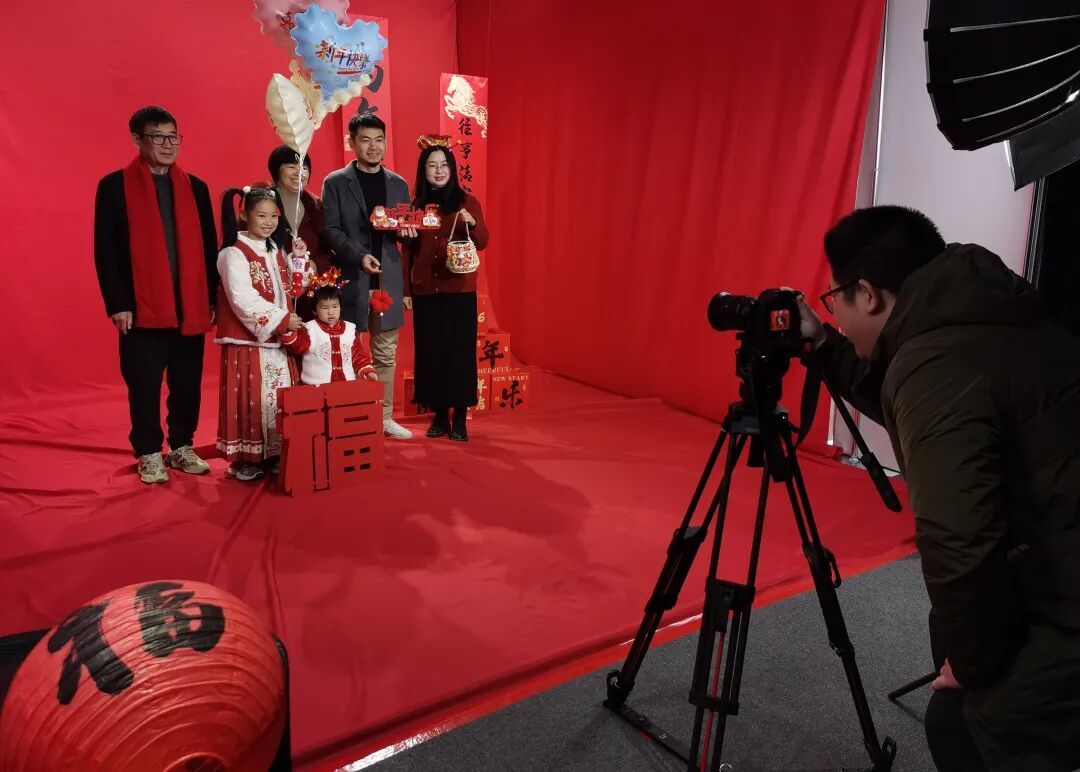 家住附近的邵先生一家六口装扮一新来到活动现场。在喜庆的“福至新春”布景前,两个孩子身着传统服装,手拿彩色气球;爷爷系着大红围巾,笑容慈祥。一家人相互整理衣衫,靠拢在一起。“看镜头,茄子!”在摄影师的引导下,一张洋溢着温馨与团圆的全家福瞬间定格。“非常开心!这样的活动特别有仪式感,是一份暖心的新年礼物。”邵先生满意地说道。