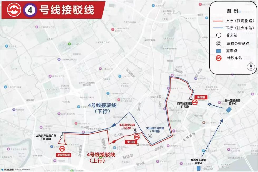 同时,为保障乘客出行,此次改造受影响的区段同步开通两条免费公交接驳线。其中,3号线接驳线往返3/4号线上海火车站站与3/8号线虹口足球场站,中途停靠3/4号线宝山路站和3号线东宝兴路站;4号线接驳线往返3/4号线上海火车站站与4/10号线海伦路站,中途停靠3/4号线宝山路站。