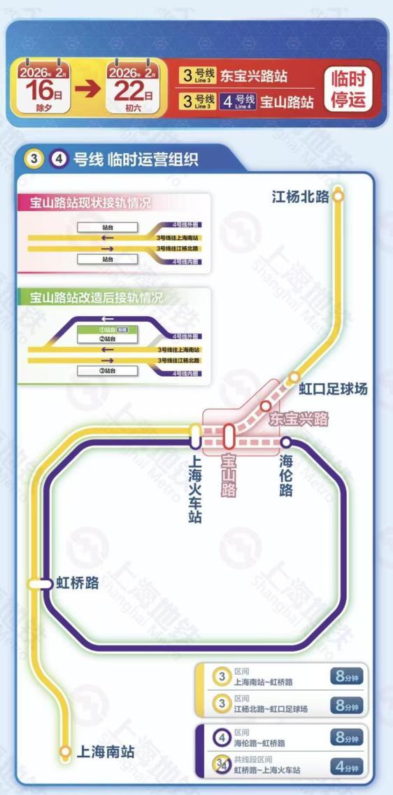 此次施工涉及3/4号线宝山路站和3号线东宝兴路站,两座车站暂停运营服务,3号线上海火车站站(不含)至虹口足球场站(不含)区段,4号线上海火车站站(不含)经宝山路站至海伦路站(不含)区段受此影响临时停运。往返浦东浦西的4号线乘客需注意列车行驶方向,如从世纪大道站前往上海火车站,需选择内圈运行的方向。