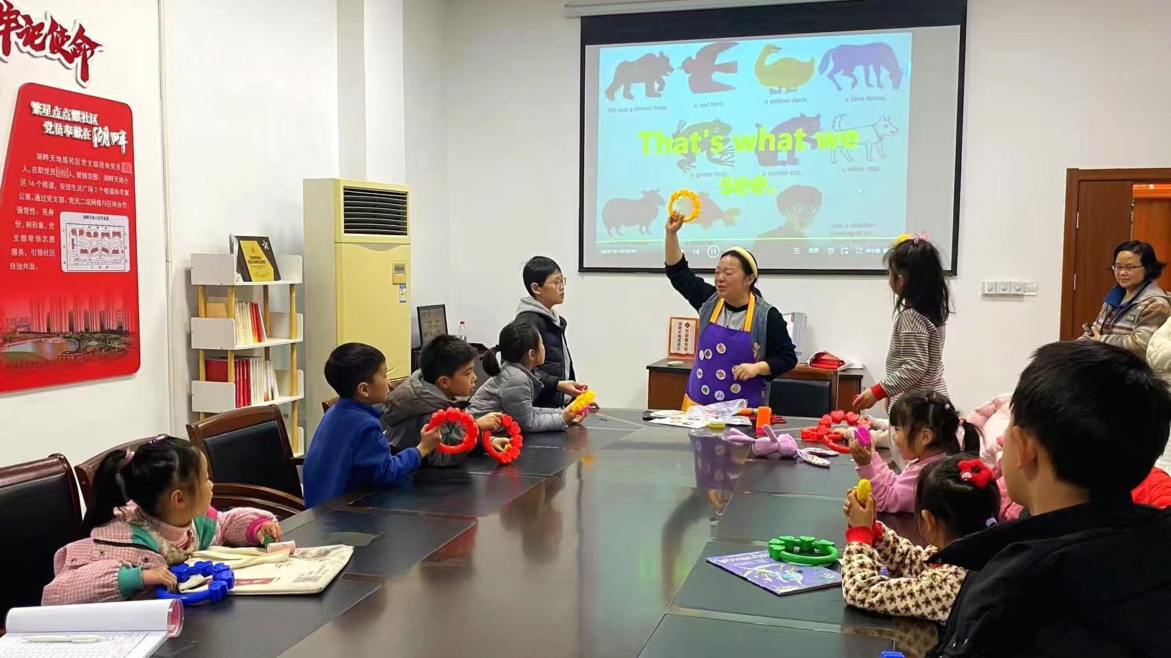 2月4日,湖畔天地小区活动室里童声笑语此起彼伏。志愿者老师带领十几名小朋友沉浸在英语绘本《BROWN BEAR》的世界,配合生动的动物叫声模仿,引得现场欢笑不断。趣味游戏环节,孩子们玩起英文单词“寻宝”;手工创作时间,大家动手制作彩色转盘,贴纸、颜色和小机关在指尖组合成一个会转动的小作品。小学生乔纾泽兴奋地展示成果:“我最喜欢找动物贴纸的游戏,找到了好多!”湖畔天地居民区党支部书记俞祝玲介绍:“这只是系列活动的开端,后续还有‘幸运摇摇马制作’‘元宵花灯制作’等精彩内容,让孩子们的假期充实又有趣。”