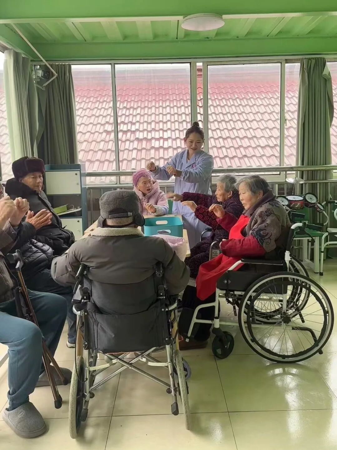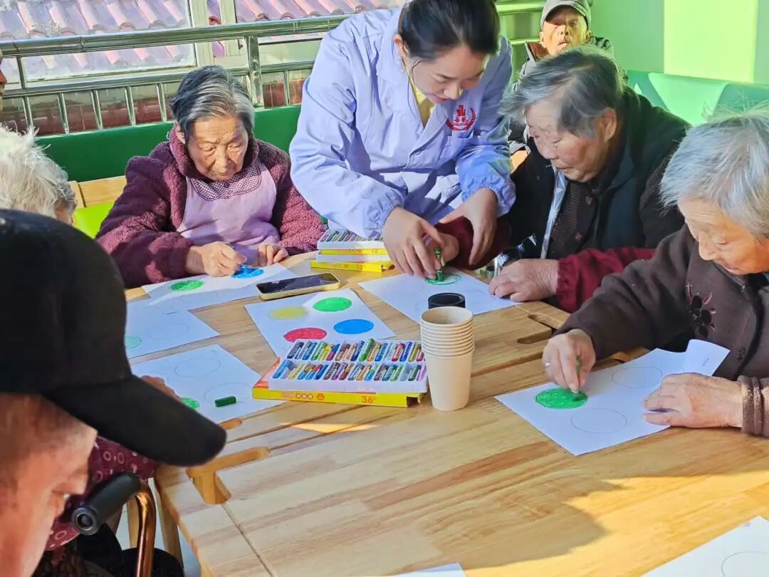 她从不称呼老人们“爷爷奶奶”,而是俏皮地叫“阿姨”“叔叔”。“这种称呼会让他们感觉自己仍然年轻,更有活力。”李媛媛笑着说。她设计的活动也别出心裁:不再是简单的“观看”,而是强调“参与”与“共创”。一起做手工、绘画、玩益智拼图;引入音乐疗法,共唱老歌;学习崇明童谣,让老人当老师;甚至开发出“桌面迷你花园”,买来植物种子,教老人播种,一起期待植物发芽,观察生命萌发的喜悦……每周三、周四的活动日,成了嘉龙养老院老人们最期盼的时光。