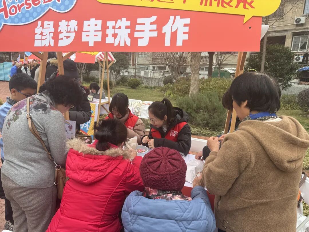 主会场外,凝“新”聚企,Horse连“联”——淡水街区年味很浓新春集市热闹开启,吸引周边居民、白领、新兴领域群体纷纷参与。集市分为“年味正浓”“非遗趣造”“公益同行”三个区域,既能采买百年品牌“恒源祥”的年节服饰,置办胡庆余堂、真老大房、老大昌、泰康食品、大富贵等老字号的年货年味,也能现场感受非遗剪纸、拓印福字、串珠手作、红绳编织等年俗文化,还能参与以书换蔬、思南读书会等公益志愿服务项目。