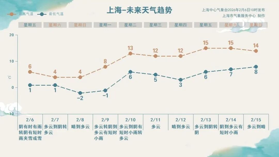 上海中心气象台预计,受此次寒潮影响,过程最低气温将出现在2月8日、9日早晨。市区最低气温为-2~-1℃,有薄冰,郊区为-7~-4℃,有冰冻或严重冰冻。2月7—8日的最高气温为5℃左右,9日白天开始回暖,最高气温为8℃左右,到春节前夕,最高气温可达14~15℃。今日雨雪转换恰逢晚高峰,道路湿滑叠加夜间可能出现的结冰,提醒市民出行需格外谨慎。