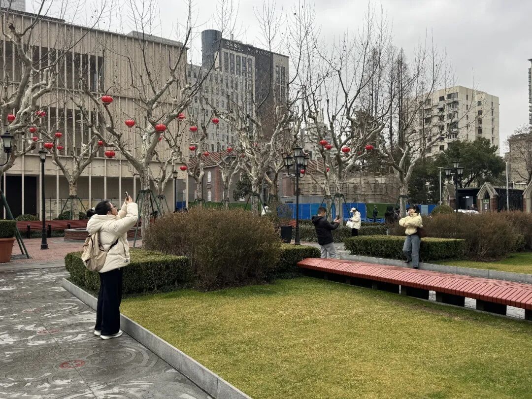 上午10时,徐家汇书院外的街头呈现出湿冷的冬日气象特征,往来市民均裹紧厚外套、缓步慢行,寒风掠过广场,体感温度比实际气温更低。行道树上挂着的红灯笼在云雾里晕出暖红的光晕,与灰冷的天色形成鲜明对比。在步道旁的绿篱前,市民们举着手机打卡书院外的红砖建筑与背景的摩天高楼。