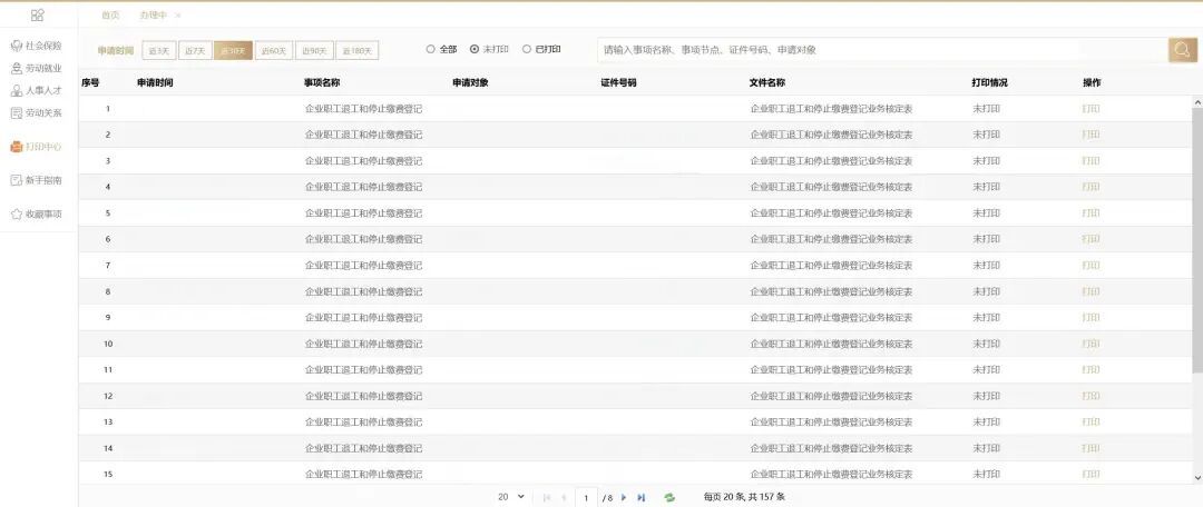 点击进入首页左侧“打印中心”栏目,即可查询打印近180天内办结的业务核定表。