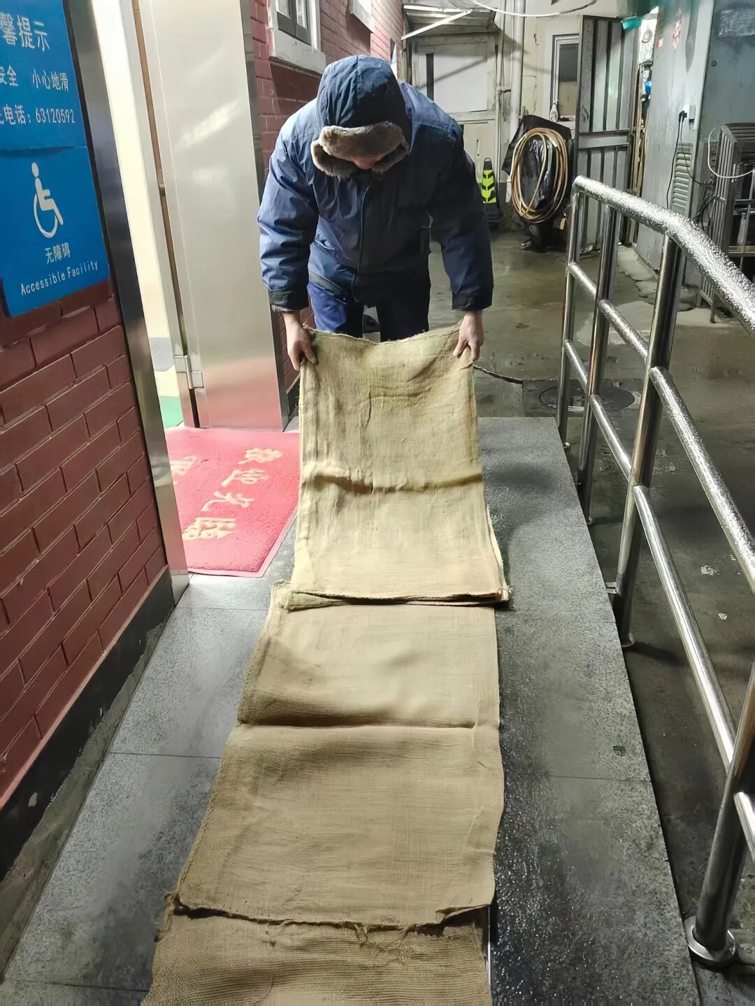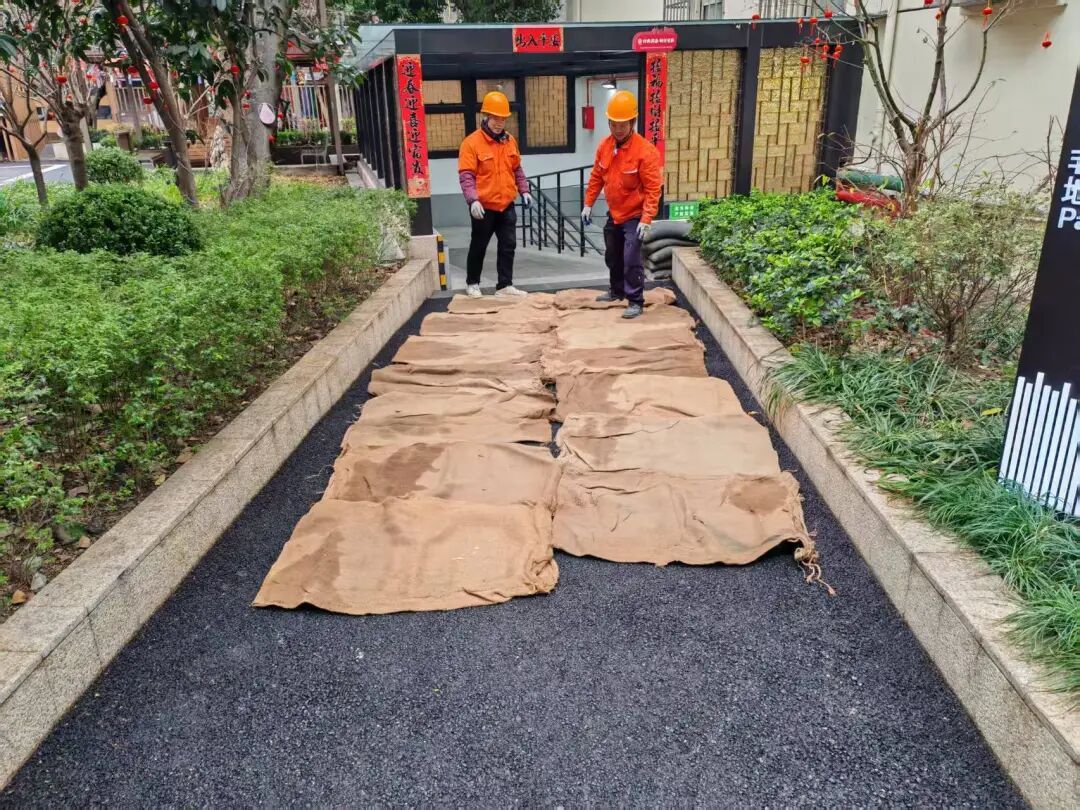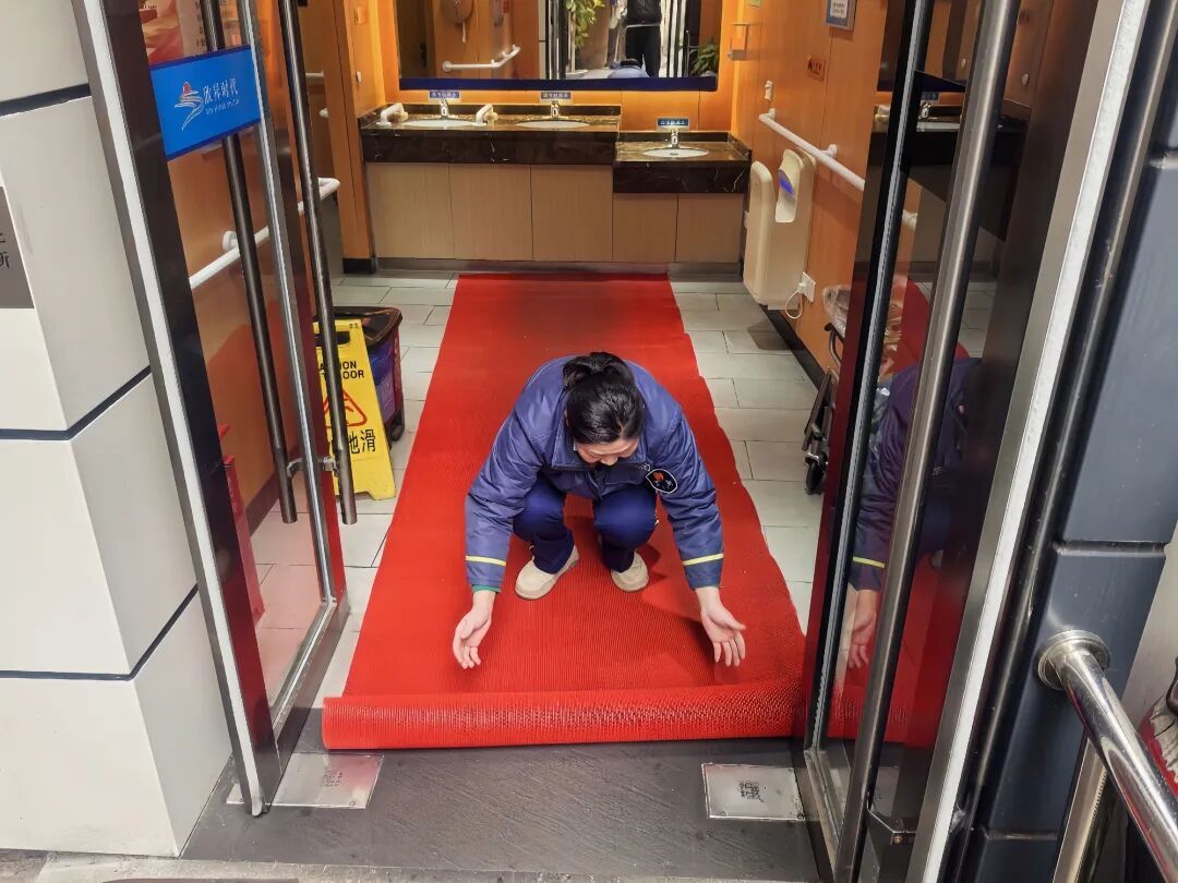 黄浦各大环卫公司也闻令而动,迅速升级雨雪冰冻天气防护举措。欣晨公司在辖区五小设施入口、公厕门口瓷砖区域等关键点位全面铺设麻袋防滑垫,摆放防滑警示标志。