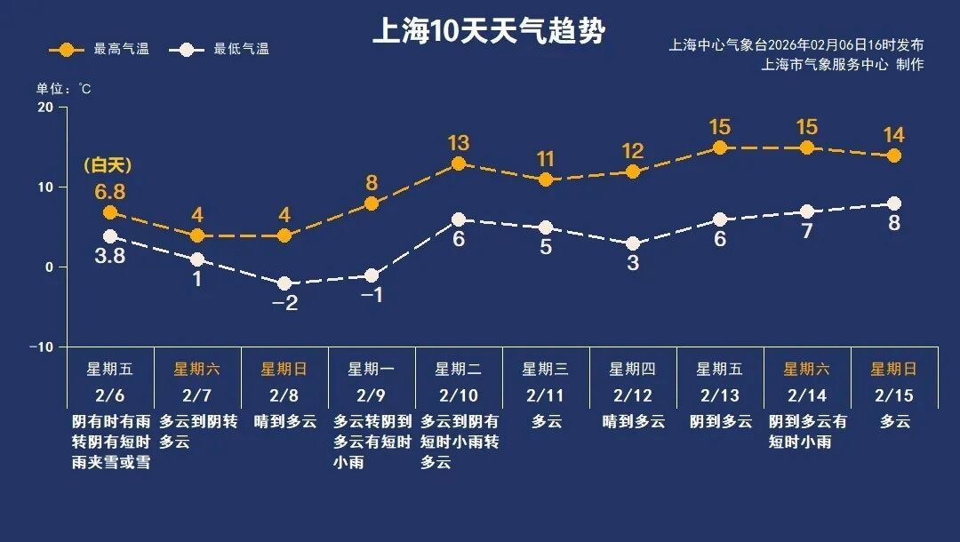 下周一早间冰冻感依旧在线,最低气温全城零下,白天最高气温升至8℃上下。下周初和周后期上海分别有两次降雨过程,其它时间以多云为主。气温恢复回升的趋势,最高气温基本在11~15℃。