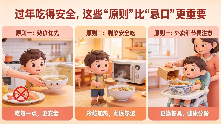 过年期间点外卖、订年夜饭很常见,需要注意选择正规商家、收到后尽快食用、冷掉的食物要充分加热。特别提醒:外卖餐盒不是无菌的,给孩子分餐时建议更换干净餐具。