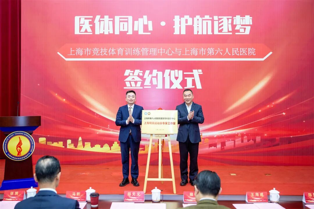 市第六人民医院党委书记郑元义、市竞技体育训练管理中心党委书记王海威共同为“国家骨科医学中心上海精英运动员专家工作室”揭牌