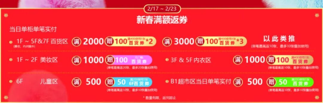 活动期间,在指定楼层单柜消费满额,即可获得相应百货或超市礼券,优惠覆盖美妆、服饰、儿童、超市等全业态。