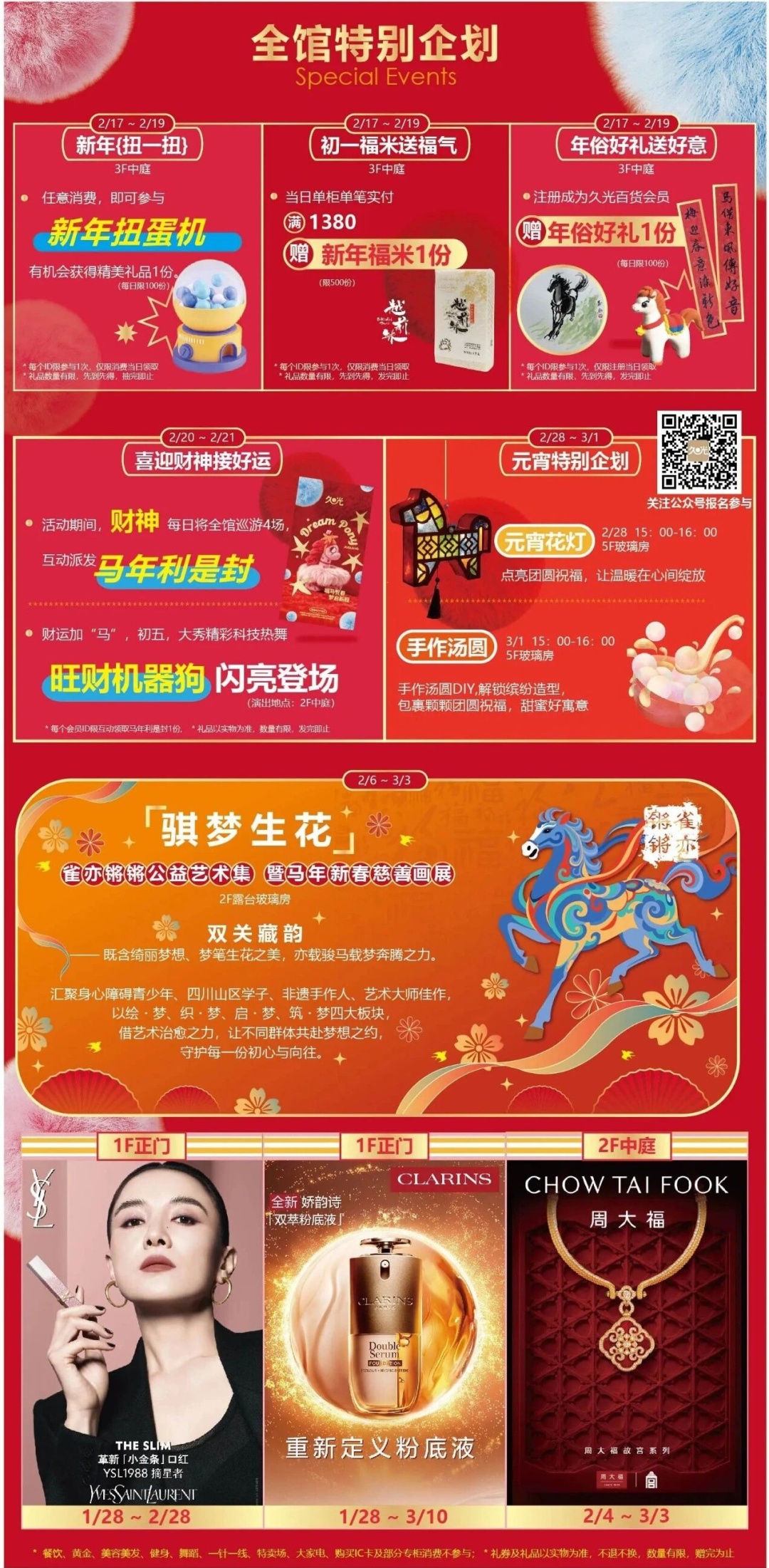 久光百货的系列主题精彩活动,是全区“新春消费季”的温暖缩影,不仅点燃了城市的消费热情,更以“骐梦生花”“马上有福”等巧妙构思,营造出灵动而温馨的传统年味,让市民的每一次购物休闲,都能成为感知城市温度、乐享美好生活的难忘体验。