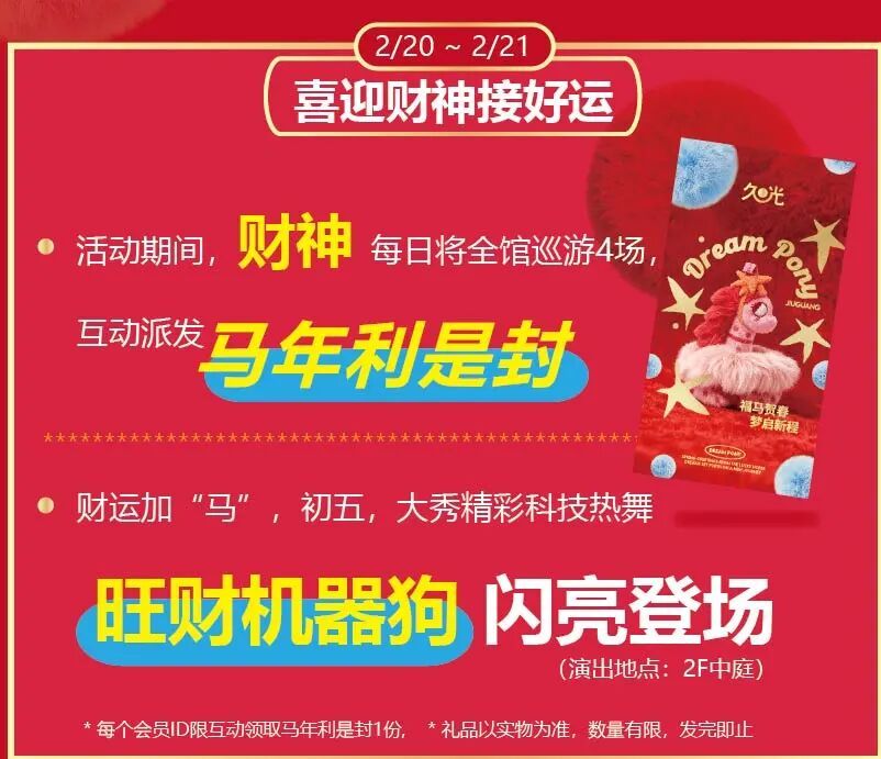 大年初五及初六,财神将现身全馆巡游派发利是封,同时2F中庭将有科技感十足的机器狗热舞表演,为顾客迎接龙年财气增添喜庆与互动乐趣。