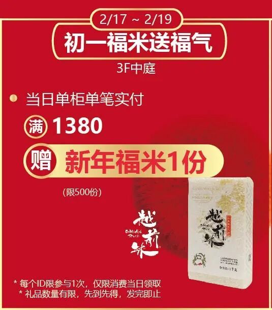 当日单柜单笔实付满1580元,即可获赠寓意吉祥的新年福米一份。