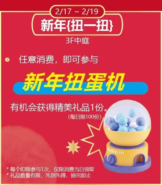“扭一扭”:在3F中庭,任意消费即可参与扭蛋抽奖,百分百有礼。