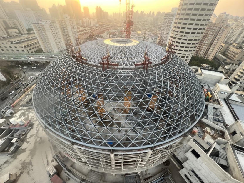 据悉,该钢网壳幕墙一体化采光顶重达252吨、直径45米、面积约1600平方米,是项目建设的核心难点之一。团队在借鉴前期桁架层“地面原位拼装+整体液压提升”施工经验的基础上,突破传统分步施工模式,创新采用钢网壳幕墙运用了地面一体化拼装、一次性系统提升的施工工艺。施工方表示,这种模式既能大幅减少交叉作业冲突,降低施工安全风险,又能显著节约临时设施搭建的成本,提升整体施工效率,具有高效、节能、安全的优势。