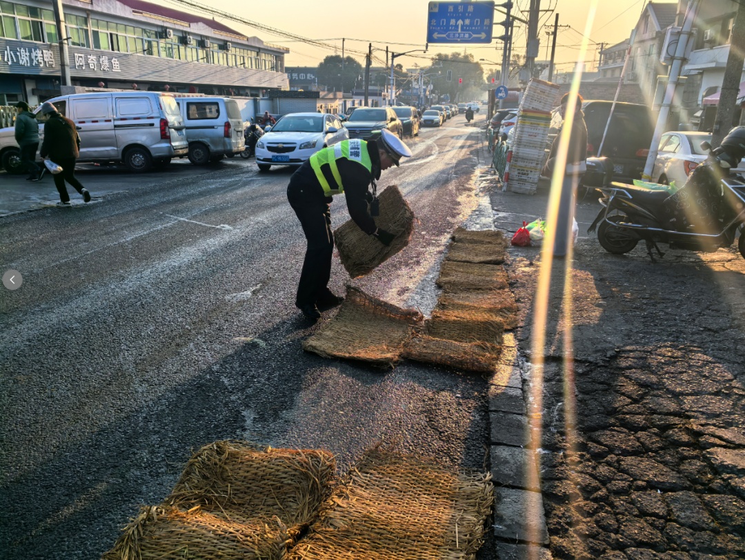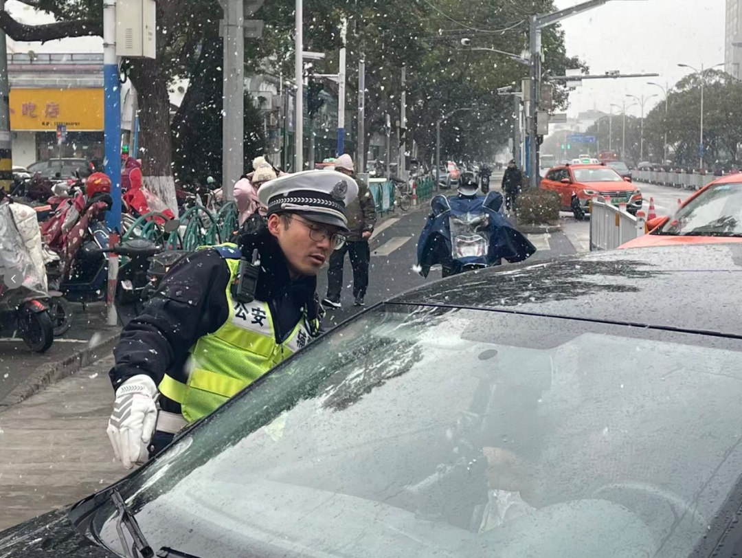 从“管理者” 到“清障人+服务生” 不仅要指挥好交通、疏导好车流,更是路面隐患的第一“清障人”,还是司机们的“移动服务点”。 崇明交管支队一大队副大队长郁佳俭介绍,寒潮中他们的每一辆巡逻警车都变身为“应急服务车”,车上标配除雪盐、草垫、铁锹等工具,有的民警还自发添置了热水壶、简易充电宝和急救包等物资以备不时之需。 冷风呼啸,天空飘着雪花,一辆小轿车在东门路北门路路口突发故障无法启动,执勤民辅警第一时间上前排查,一边与车主合力将故障车推至路边安全区域,并帮其联系修车,一边有序指挥疏导过往车辆,在最短时间内让交通恢复如常。另一边,民警顾浩天巡逻至南横引河桥上时,发现有一处结冰路段,便和辅警一起垫草垫、撒盐粒,用铁锹破冰,两只手冻得发红,一路过车辆的司机看到这一幕,为他们送来了暖宝宝,市民的关怀,暖了民辅警的手,也暖了彼此的心。