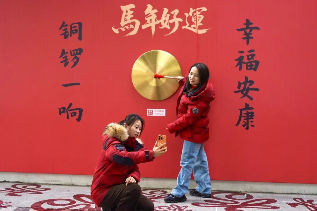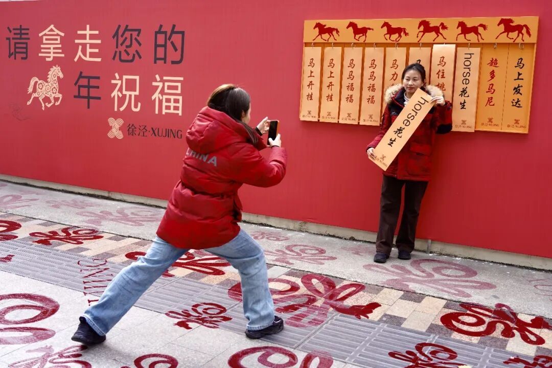 随着春节的脚步越来越近,徐泾镇京华路也悄悄“上新”啦!最近路过这里的市民朋友,都会感受到不一样的惊喜——两处超吸睛的巨型打卡墙火热“出圈”,一处在公交站后,一处绽放在京华广场中央,瞬间拉满了整条街的新春氛围感! “来来,先帮我拍一张!”还没走近,就听到阵阵欢笑。在京华路公交站背后,一面长达56米的“中国红”打卡墙早已成为人气焦点,墙面设计巧妙融合了多种互动玩法: 一敲锣响,福气开场 伸手轻敲墙上的立体锣面,“铛——”一声清响,寓意“锣声一响,福气到家”,不少市民特意来讨个开年好彩头。 有福“抱”,好运到! 一个萌趣十足的“福”字长出了柔软可爱的触手,变成可以拥抱的“福抱抱”。搂住它合张影,仿佛把满满的福气抱了个满怀。 祝福随行,“马”上带走 墙上挂着多款印有马年吉祥话的祝福签,“马上开挂”“horse花生”……过往行人可随意取走钟意的马年祝福语,把吉祥揣进口袋,寓意整年顺遂。 脚下踩福,步步有福 最让人驻足的是地上连绵展开的“踩百福”地绘——上百个风格各异、融入骏马元素的“福”字,一笔一画,皆透着手绘的温度与灵动,仿佛一幅铺展于街面的吉祥长卷。行人走过,忍不住低头细品,或用脚步轻轻“踏”过心仪的福字,寓意“一步一福,福随步生”。 这上百个福字,全部出自拥有30年油画经验的熊师傅之手。“虽然我不是本地人,但在这儿生活了很多年,早把这里当成了第二故乡。”熊师傅一边收拾画笔一边笑着说,“把这些‘福’一个个画在地上,就是希望每一个路过的人,都能‘踏福而来’,把祝福实实在在地带走。也是我们这些手艺人,用画笔在诉说对市民的祝福。” 沿着京华路往南走不远,广场上的金色铃铛墙同样耀眼。“铃铛一响,福气登场!”有风吹过时,铃铛造型的光影随之闪烁,与满墙金光交织,仿佛唤醒了整条街的节日生机。 一条京华路,百年徐泾韵。新春氛围墙不只是拍照背景,更是徐泾送给大家的一封“地面情书”——把福气铺在你脚下,把祝福递到你手中,把年味暖送进你心里。一街一景,皆是用心;一步一福,满是关怀。新年,大家一起踏福前行! 记者:杨洋 摄影:杨洋 编辑:俞静彦 责任编辑:李艳丽(首席) 转载请注明来自“绿色青浦”官方微信