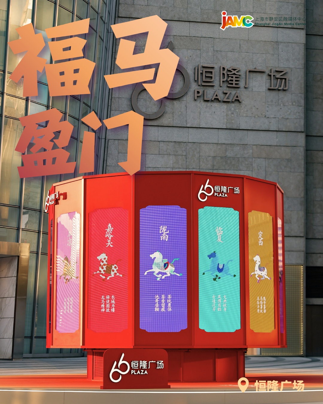 红色走马灯装置灵动旋转,十四匹铜奔马衔尾相依、环伺而行,将十四重新春祝福尽数承载,奔腾的姿态象征着福运连绵、生生不息。祝您在新的一年里,日日福马盈门!