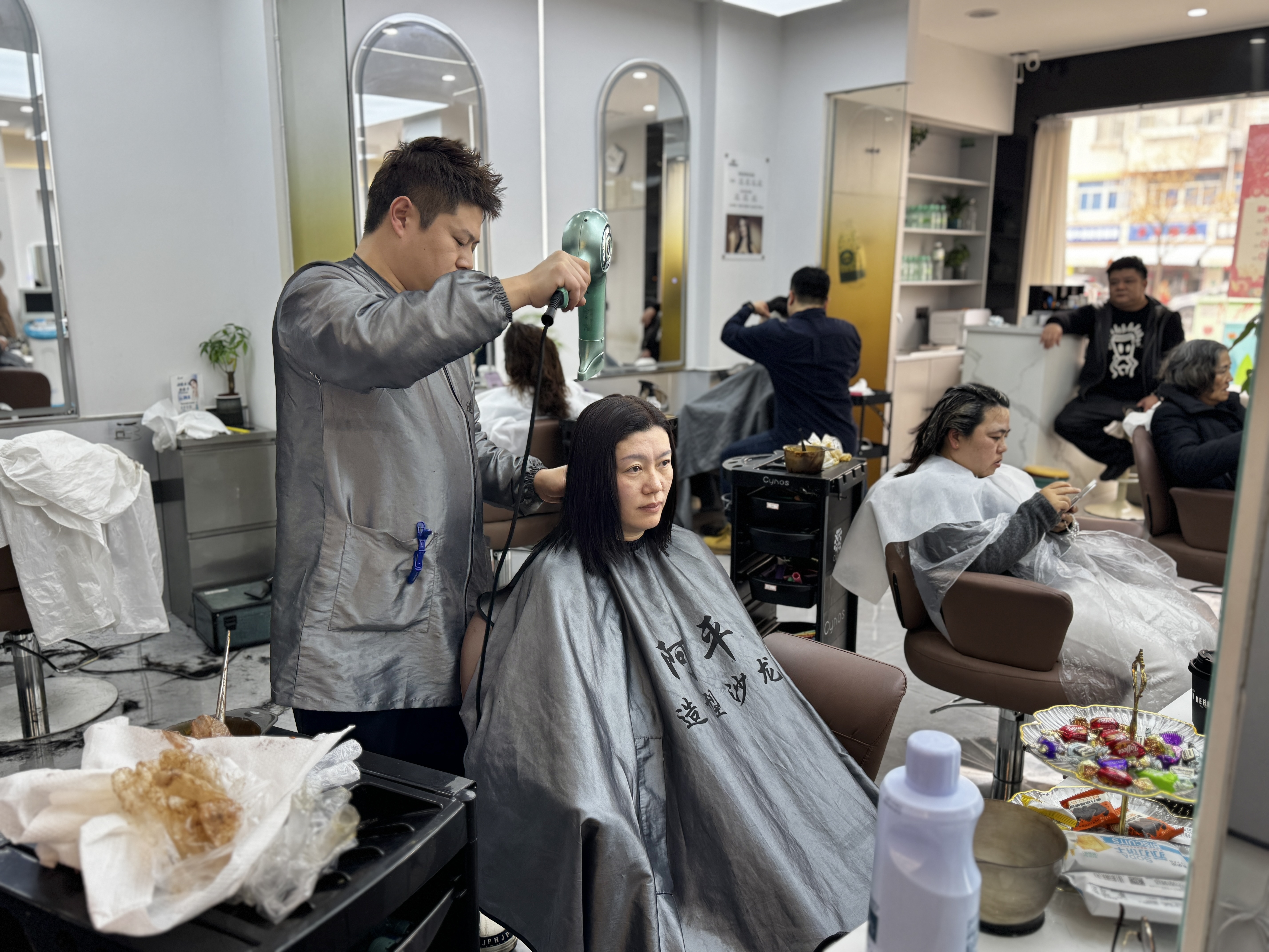 为应对客流高峰,门店全员上岗,并将营业至2月15日。“看着顾客们顶着新发型,笑着道‘新年快乐’离开,我们觉得特别有意义。”崔露平说。