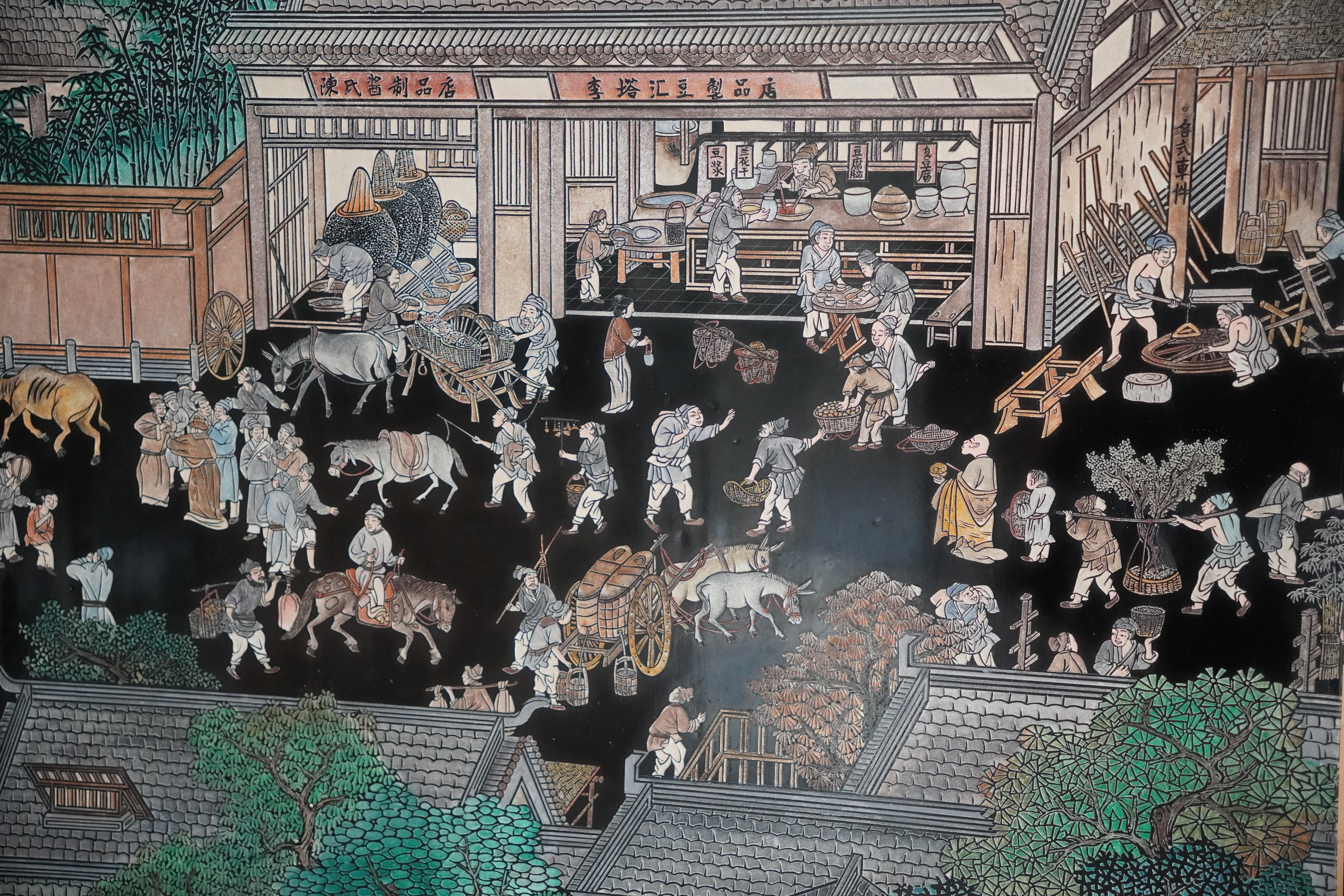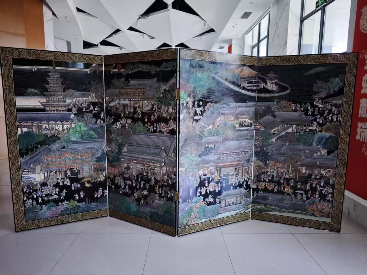 “刻漆最难的不是塑形,是刻出‘将动未动’的瞬间。”陈尹然指尖抚过屏风上细密的刀痕,目光专注。这件耗时8个月完成的作品,深黑漆底上的刻痕如流水铺展,仿佛能听见明清集市的喧闹声。380个人物衣褶带风、眉眼含神:染坊花布似要飘出画面,李塔汇的豆腐刚出锅冒着热气,箍桶匠的手正待落下,点心铺的香气仿佛穿透漆层。