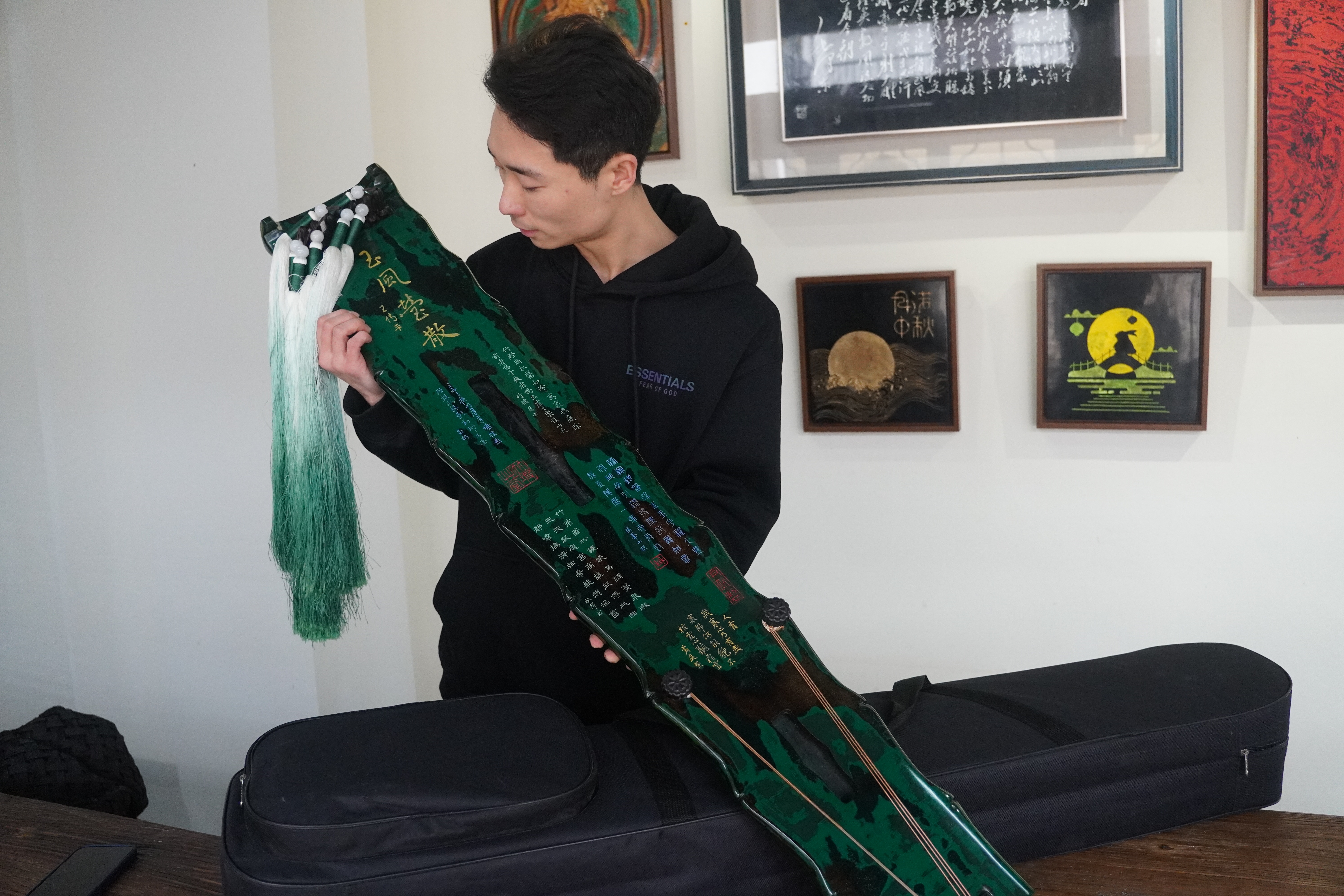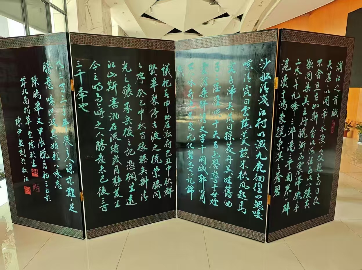 近年来,陈尹然执着于非遗创新,探索刻漆技艺的跨界融合。工作室里一把古琴尤为夺目:琴背以八宝灰为底,用刻漆技法题琴名“玉风莹散”,满刻琴铭,尽显文人雅韵。“传承不是墨守成规,要让非遗走进现代生活。”陈尹然说。