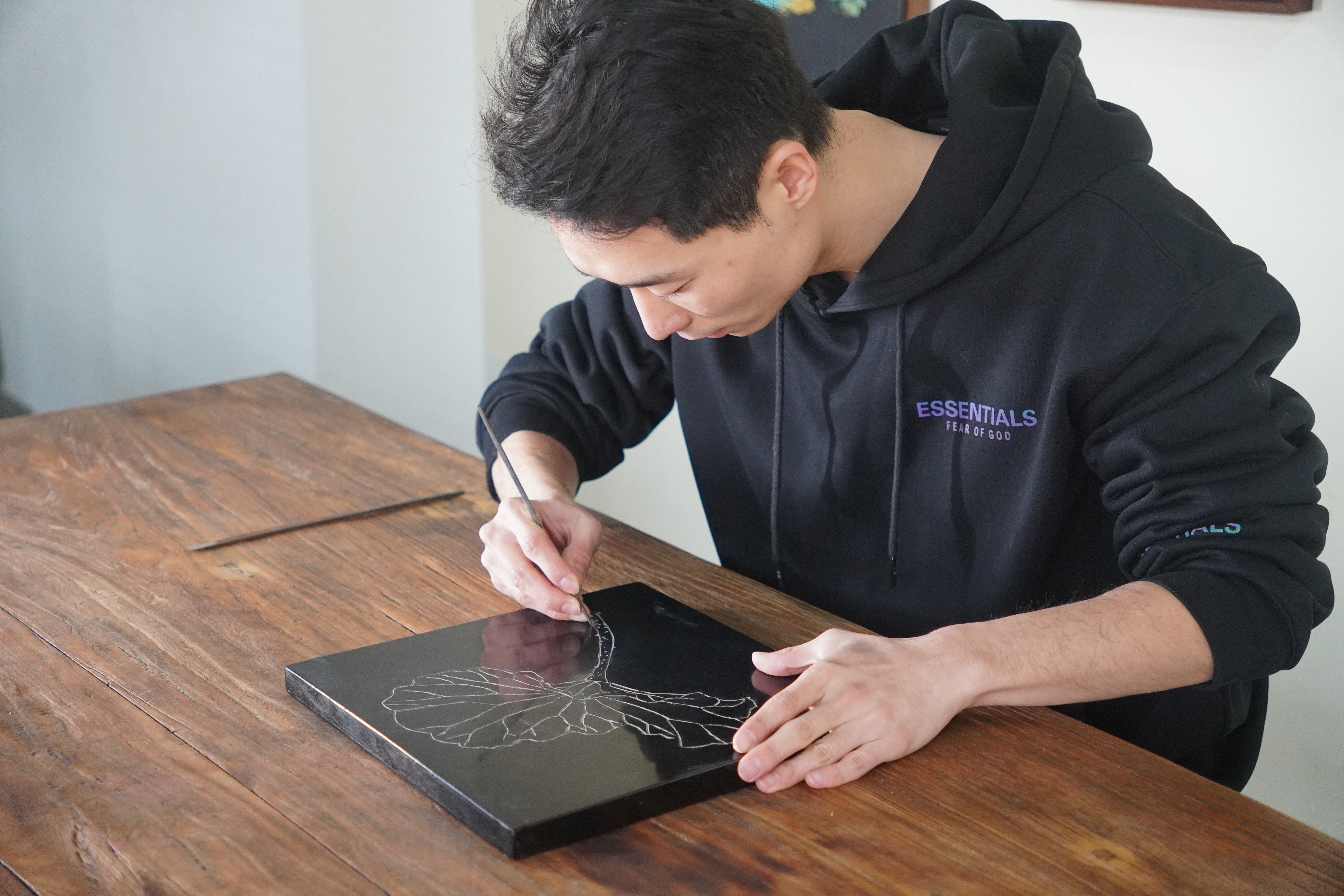 2018年毕业后,陈尹然留校任教于上海工艺美术职业学院漆艺工作室,却始终牵挂家乡非遗发展。业余时间,他频繁回到松江,指导传习基地学员、参与社区文化活动,致力让年轻人了解刻漆之美。“刻漆不该只停留在非遗名录里,它可以是书桌上的文具、家居中的装饰、舞台上的乐器,甚至是时尚设计的亮点。”陈尹然望着工作室里的作品,眼中满是坚定,“师傅见证过刻漆的辉煌,我想通过创新与普及,让这门技艺以新的方式‘活’下去。”