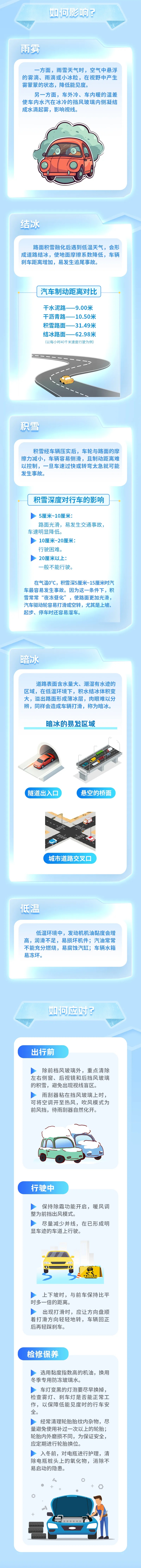 市公安局交通管理总队介绍,低温雨雪是对低温状态下伴随降雨或降雪天气的统称,常发生在冬、春季节。低温雨雪往往会给道路交通带来诸多不利影响,驾车出行需要格外注意。详见↓